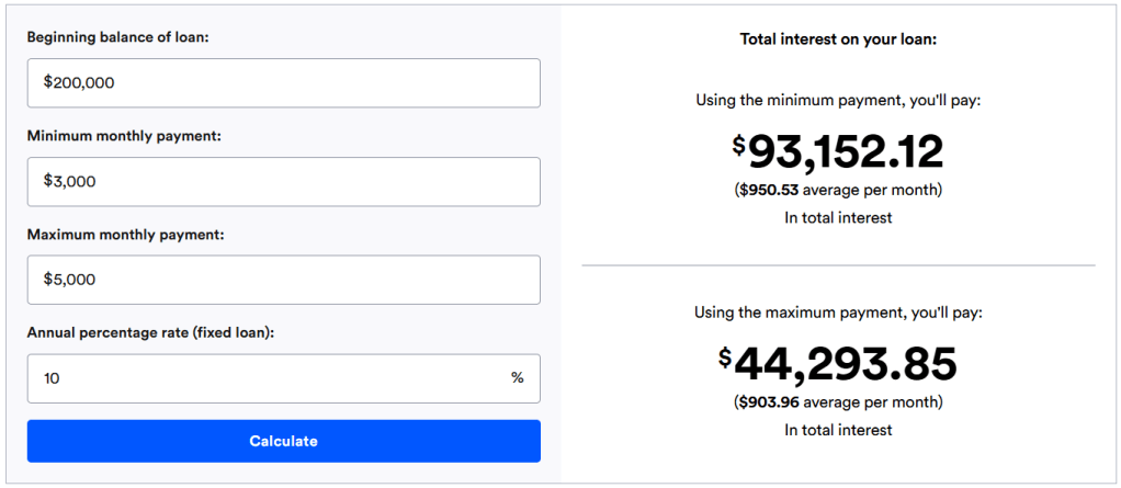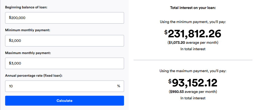We have a high risk borrower and a low risk borrower. Let us call the high risk borrower “Gimme S’more” and the low risk borrower “Rich McGee.” Gimme and Rich submit their loan application for a house. They want the same house that’s valued at $200k. They get a fixed rate installment loan so it’ll last as long as it takes to pay off the loan. They both get approved! They have a minimum payment of $2000 and a maximum payment of $3000. However, Gimme has a 10% interest rate and Rich has a 5% interest rate. (Thank you Bankrate.com for your loan calculator!)